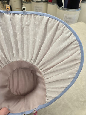 Materials: buckram, millinery wire, Elmer's glue, thread, batting, satin, Swiss dotted cotton, lining fabric, ribbon, lace, buttons